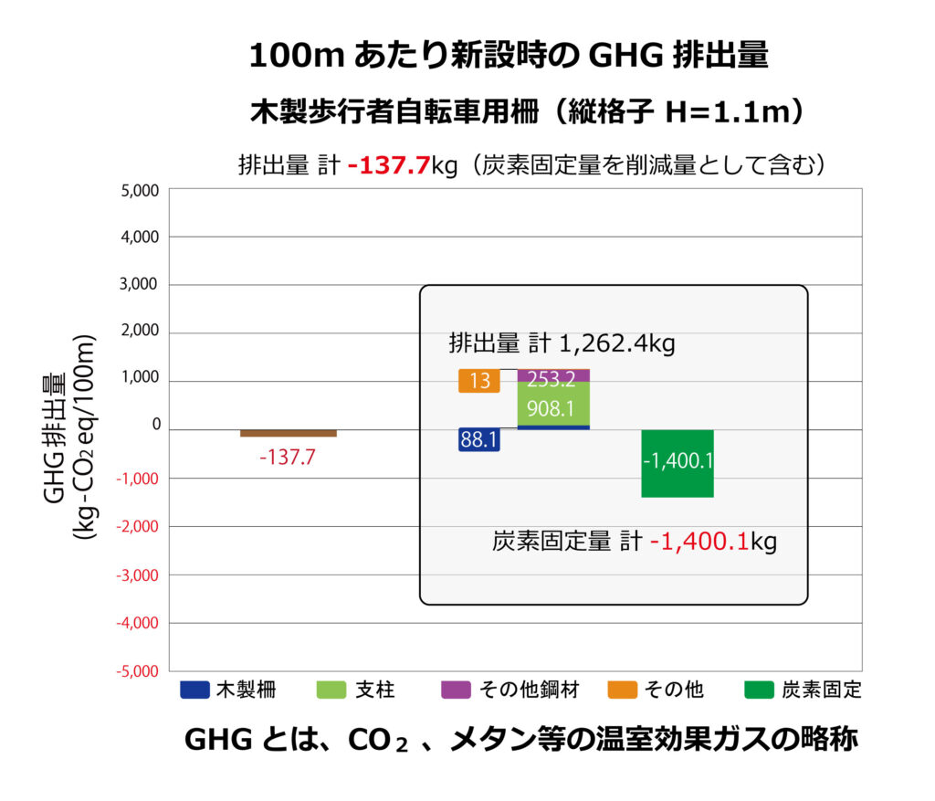 このことから木製歩行者自転車用柵は製造段階でのGHG排出を実質的に相殺し、さらに上回る「カーボンニュートラルを超える炭素吸収型製品」として環境負荷の低減に貢献します。